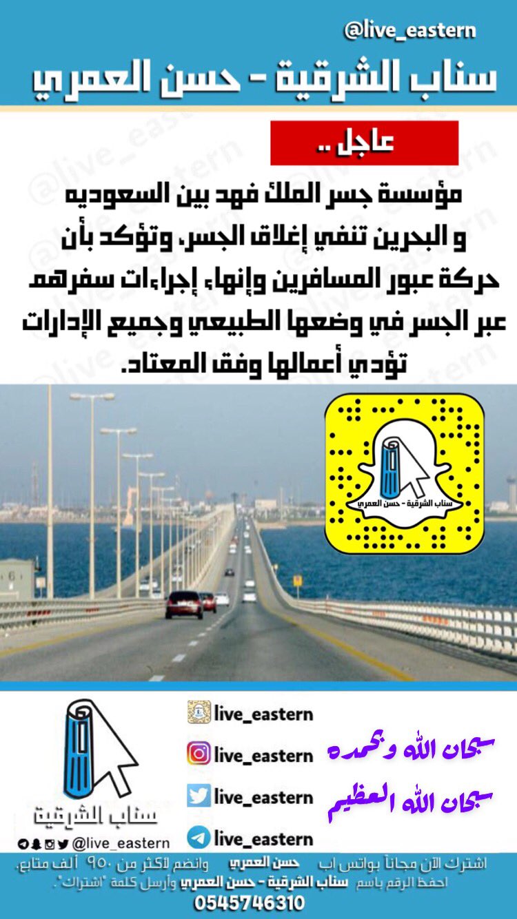 سناب الشرقية حسن العمري On Twitter مؤسسة جسر الملك فهد تنفي إغلاق الجسر وتؤكد بأن حركة عبور المسافرين وإنهاء إجراءات سفرهم عبر الجسر في وضعها الطبيعي وجميع الإدارات تؤدي أعمالها وفق